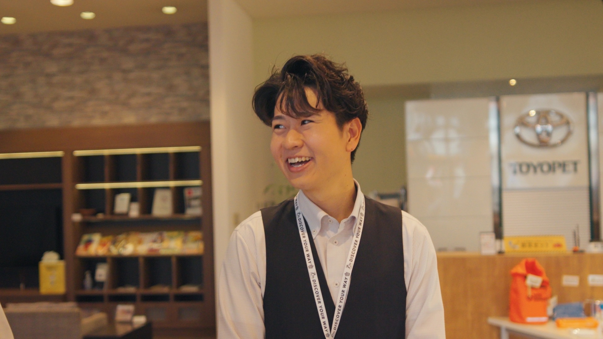 営業に少しだけ興味があって、営業で絞って見ていました。 当時色々な企業さんが集まるイベントがあって、たまたま愛媛トヨペットのブースを見つけて。 その時の人事の方がすごく良くしてくださったのは1つのきっかけですね。