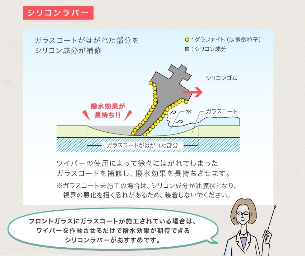 ※ガラスコーティングが未施工の場合は、シリコン成分が油膜場となり、視界の悪化を招く恐れがあるため、ガラスコート用のシリコンワイパーの装着はしないでください。