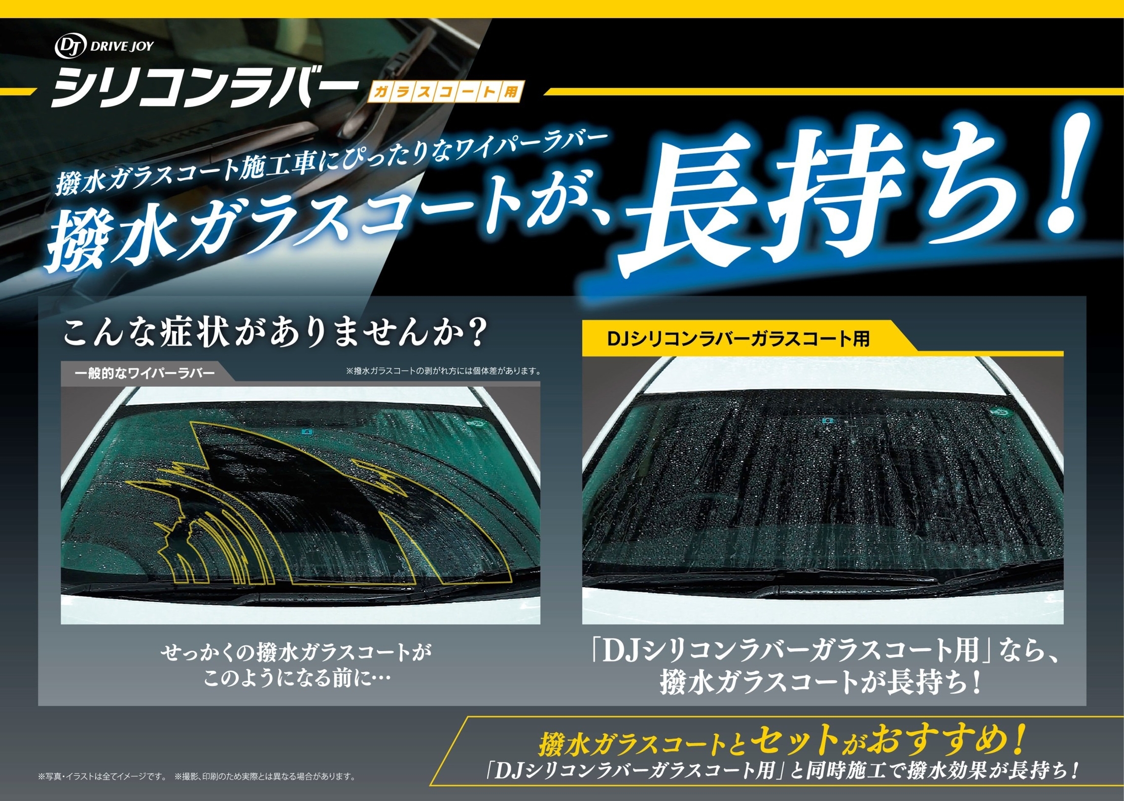シリコンワイパーラバー(ガラスコート用)とは、ワイパーの使用によって徐々に剥がれてしまったガラスコーティングを、ラバー内に含まれたシリコン成分が撥水ガラスコート被膜面の凹部分に塗られ、撥水ガラスコーティング被膜を均一な厚さに維持をし、視界を確保してくれます!
