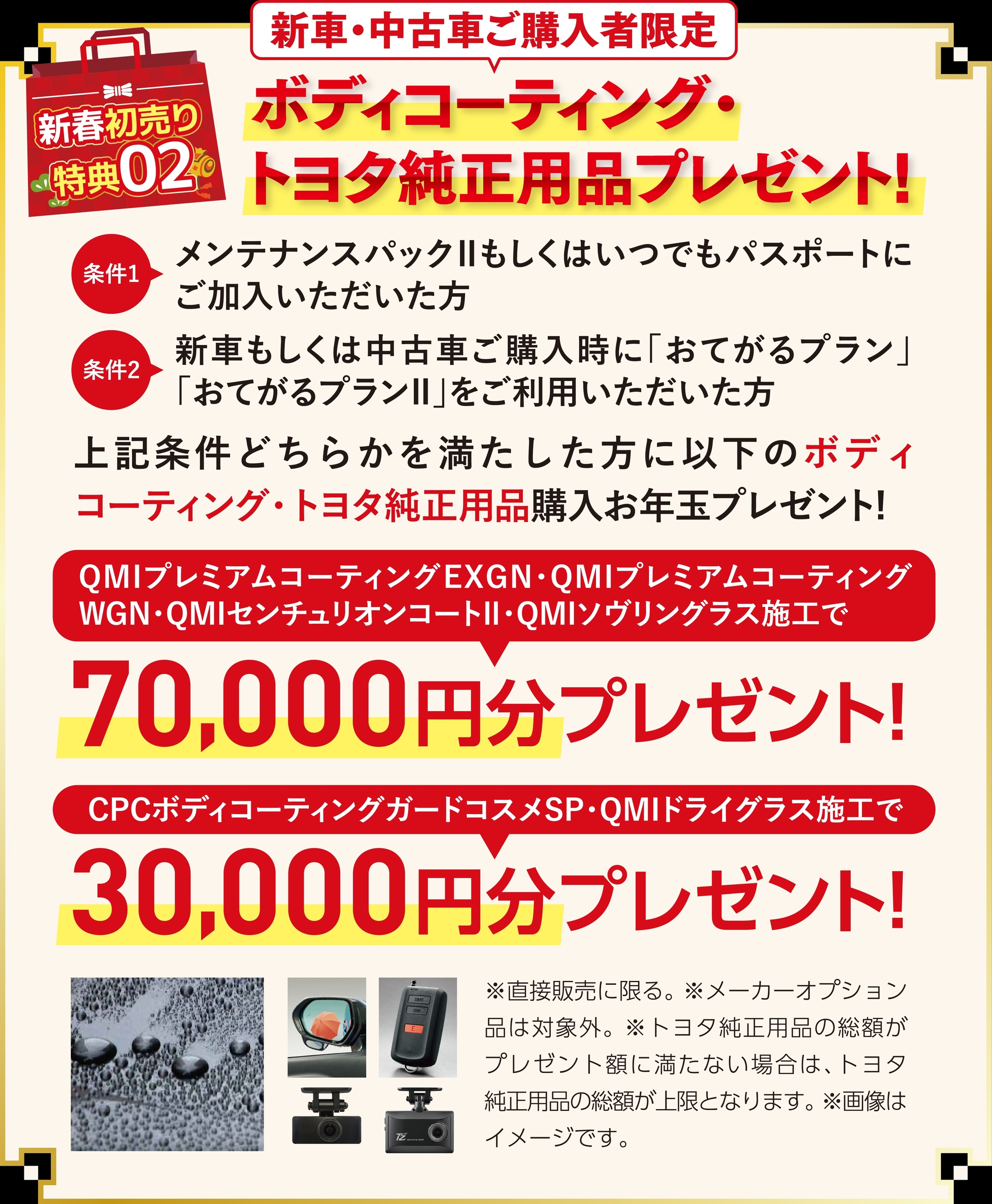 期間中、新車・中古車をご購入いただいた方にボディーコーティング・トヨタ純正用品をプレゼントいたします🎁